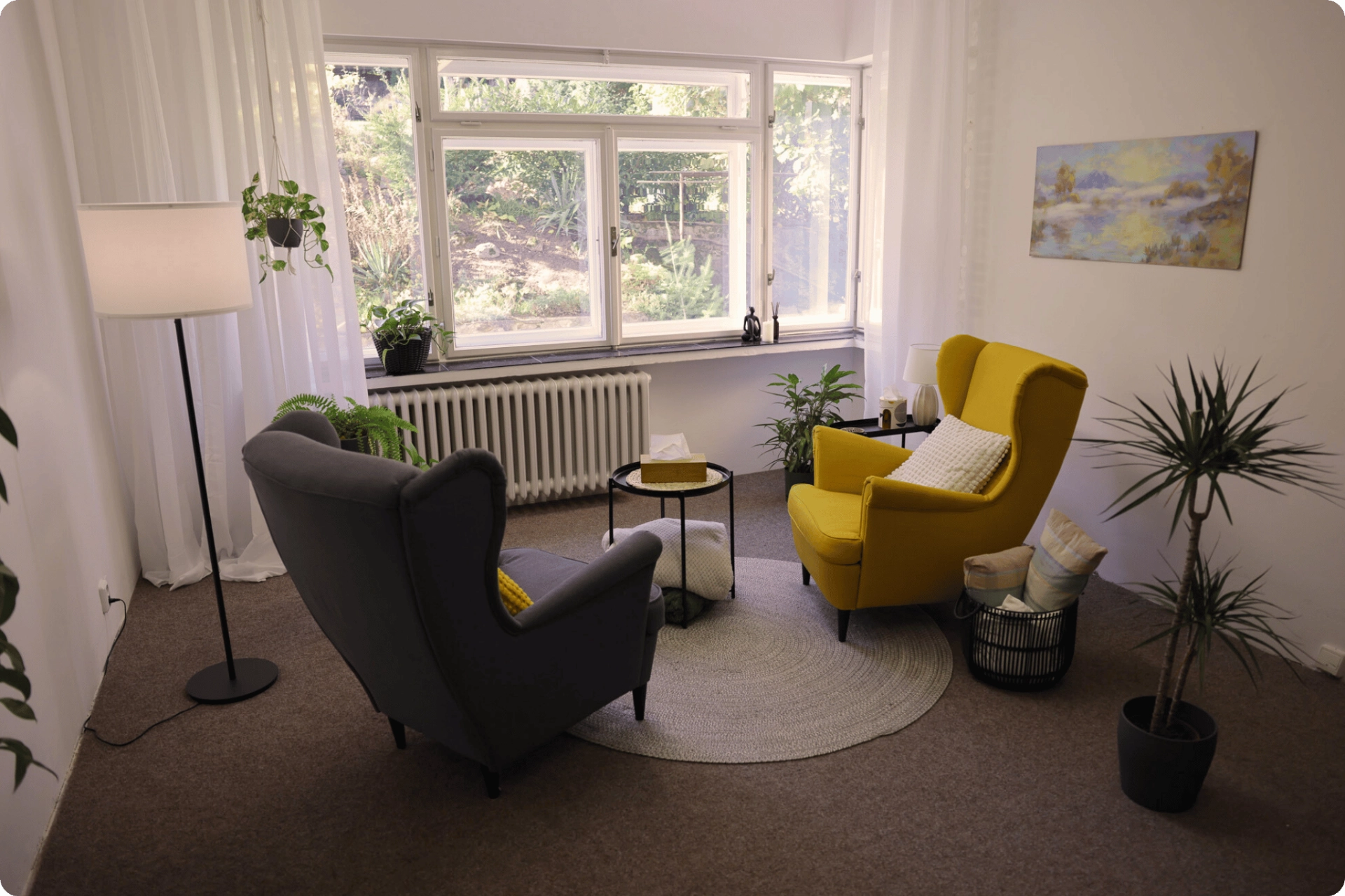 Prostor je klidný, útulný a poskytuje bezpečné a diskrétní zázemí pro vaši práci na sobě.
